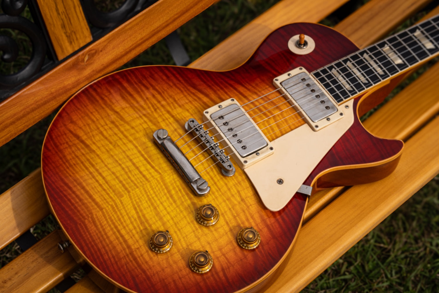 The hardware is anchored by a St. Helen bridge and tailpiece, paired with Retrospec Offset studs for true vintage resonance and rock-solid sustain. Electronics feature RetroSpec Vintage Taper pots, 50s-style wiring, and Luxe Bumblebee capacitors, ensuring tonal purity and dynamic control reminiscent of original golden-era circuits.